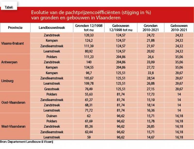 De pachtprijs wordt in de huidige regeling 3-jaarlijks bepaald met commissies per landbouwstreek en per provincie. De basis voor een pachtprijsstijging is meestal het landbouwrendement dat wordt opgesteld door het ministerie van Landbouw. De pachtprijs wordt bepaald door het niet-geïndexeerde kadastraal inkomen te vermenigvuldigen met een coëfficiënt die om de 3 jaar wordt herzien. De evolutie in Vlaanderen per landbouwstreek wordt weergegeven in onderstaande tabel.