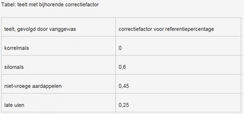 Het gaat over korrelmaïs, silomaïs, niet-vroege aardappelen en late uien, gevolgd door vanggewassen. Voor die teelten, zal het referentiepercentage worden vermenigvuldigd met een correctiefactor.