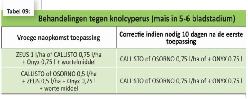 Knolcyperus zit op verschillende diepten in de grond, de opkomst van de zaailingen is redelijk gespreid over de tijd en de bestrijding ervan vereist 2 werkgangen. De eerste wordt uitgevoerd in het 5 tot 15 cm stadium van de knolcyperus, rond het 5-6 bladstadium van de maïs. Een bestrijding van 99% kan worden bekomen met een behandeling van Zeus 1 l + Onyx 0,75 l of Osorno (of Callisto) 0,5 l + Zeus 0,5 l + Onyx 0,75 l ,gevolgd door een tweede behandeling met Osorno 1 l + Onyx 0,75 l die 2 weken na de eerste wordt toegepast.