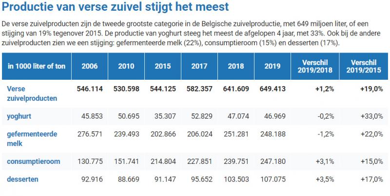 De verse zuivelproducten zijn de tweede grootste categorie in de Belgische zuivelproductie, met 649 miljoen liter, of een stijging van 19% tegenover 2015. De productie van yoghurt steeg het meest de afgelopen 4 jaar, met 33%. Ook bij de andere zuivelproducten zien we een stijging: gefermenteerde melk (22%), consumptieroom (15%) en desserten (17%).