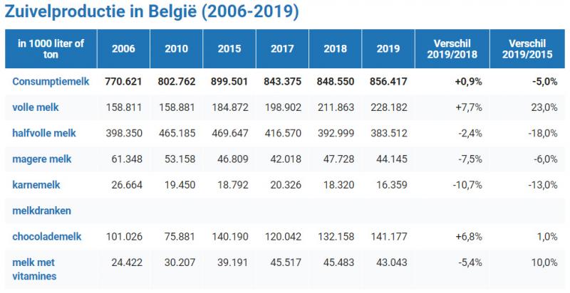 Bij de consumptiemelk wordt halfvolle melk het meest geproduceerd, al daalt de productie daar met 18% sinds 2015. Het is vooral de stijging volle melk (23%) die opvalt de afgelopen 4 jaar. In 2019 bedraagt de totale productie van consumptiemelk (chocomelk en vitamineerde melk inbegrepen) 856 miljoen liter. Dat is iets minder (-5%) dan 4 jaar geleden. Vooral de productie van halfvolle melk (-18%) en karnemelk (-13%) daalt tegenover 2015, terwijl die van volle melk stijgt met 23%. Bij de melkdranken blijft de productie van chocolademelk de afgelopen 4 jaar min of meer stabiel (+1%), en werd 10% meer melk met vitamines geproduceerd.