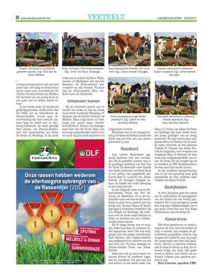 Ieder jaar valt op dat er meer volwassen koeien bij roodbont lopen dan bij zwartbont. Dit jaar was dat niet anders. In een eerste reeks won Hissa (V. Curtis) van Johan De Pauw uit Sleidinge met haar sterke bouw, een prima gedragen uier en droog beenwerk. Na haar kwam haar stalgenote Febra (V. Fidelity). In de tweede reeks veroverde de zeer gekende Violette (V. Classic) van Johan Verlodt de toppositie, voor eveneens een stalgenote Rosy (V. Redross). In deze reeks liep oudgediende Betty van Johan De Pauw, die als hoogste kg vet en eiwitkoe de CRV Rendementstrofee mee naar huis mocht nemen.