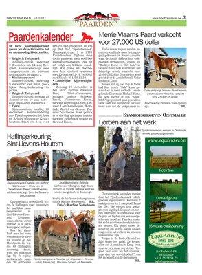 Zoals iedere najaar werden recent verschillende sales (verkopingen) gehouden in Noord-Amerika waar de Amish fokkers hun trekpaarden verhandelen. Tijdens de “Buckeye Horse en Colt Sale” in Dover, Ohio (USA) werd recent een driejarige merrie verkocht voor 27.000 US Dollar. Deze merrie werd gefokt door de Amish Peter L Yoder uit Baltic, Ohio.