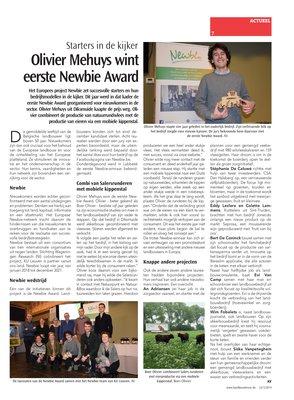Olivier Mehuys won de eerste Newbie Award. Olivier - beter gekend als Boer Olivier - besliste vijf jaar geleden na zijn economische studies om mee in het landbouwbedrijf van zijn vader te stappen. Op dat bedrijf in Diksmuide werd akkerbouw gecombineerd met vleesvee. Stieren werden afgemest en verkocht.