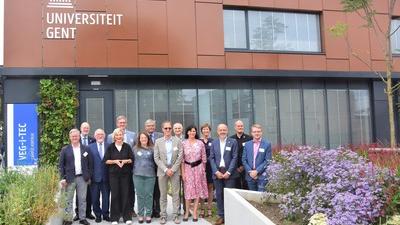 Het gloednieuwe onderzoeksgebouw van Universiteit Gent op de campus in Kortrijk werd onder ruime belangstelling officieel geopend. VEG-i-TEC is een piloothal die volledig uitgerust is als de proeftuin voor de groente- en aardappelverwerkende industrie. UGent-rector Van de Walle wees op het belang van samenwerking, minister Hilde Crevits maakt zich sterk dat onze Vlaamse land- en tuinbouw zich beter wapent door te innoveren.